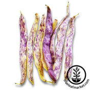 60 Days to maturity. Phaseolus vulgaris. Dragon Tongue Bean Seeds. Non-GMO, annual, open-pollinated, bush, snap, wax, romano, bean. Suitable for growing in containers, garden plots, raised beds, and greenhouses. This charming wax bush bean is an old heirloom from Europe. It has yellow-green pods that are streaked and mottled with a gorgeous purple. Plants grow in a bush growth habit. Alternative names for this bean include "Dragon Langerie" and "Merveille de Piemonte" in some regions. This bean can be harvested as a green bean when pods are crisp or left to mature further and harvested as a shelling bean. The seeds are a mottled brown and very tasty. The Dragon's Tongue Romano Bush Wax Bean is more than just a bean; it's a conversation piece, a slice of history, and a gardener's delight. ~80 seeds/oz.