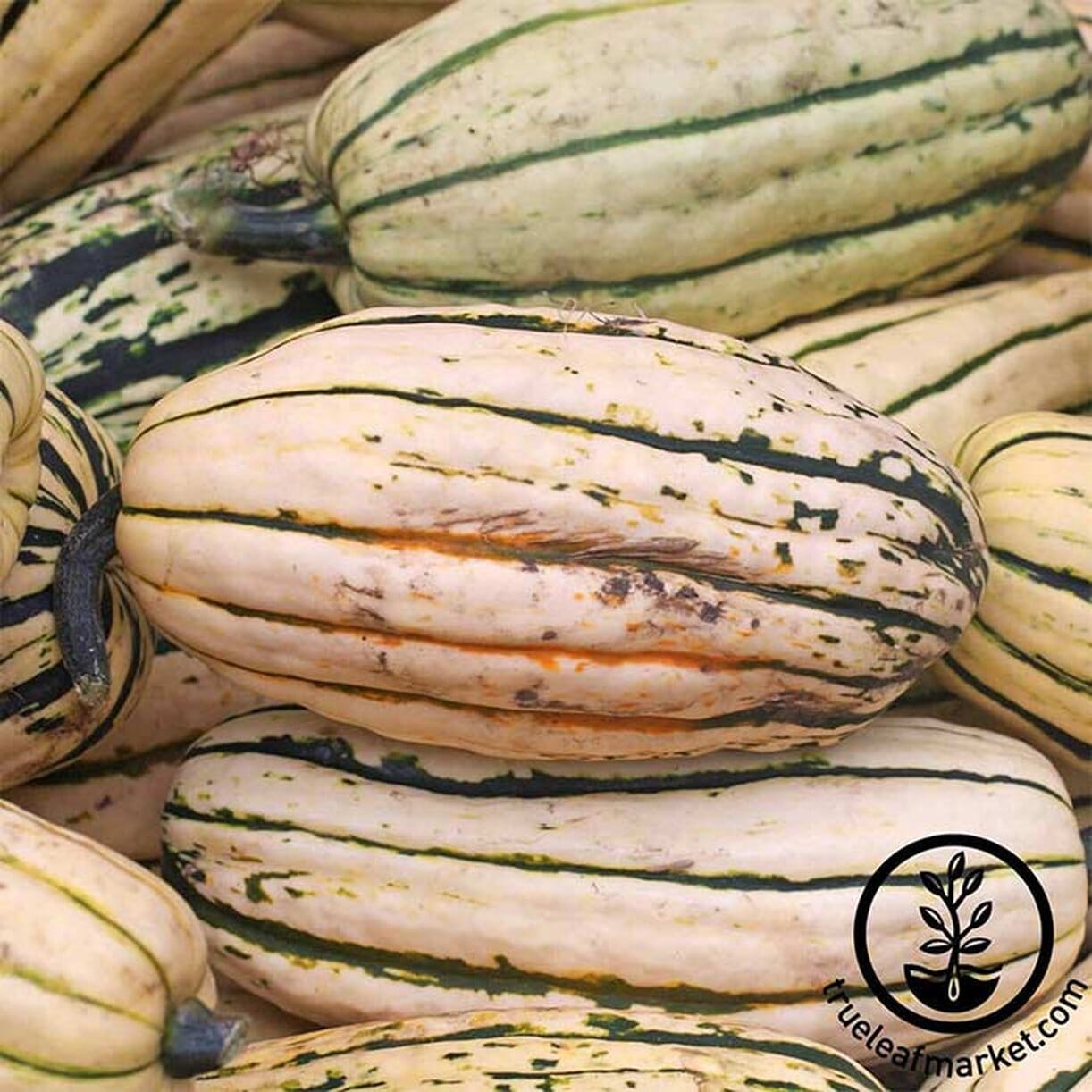 (100 days) Introduced in 1890s. Delicious, creamy sweet potato like taste. Delicata has a fine grained, light orange flesh steamed or baked.