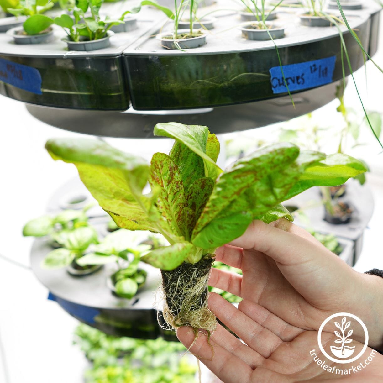 Woman holding lettuce grown with HydroPods in a hydroponic tower