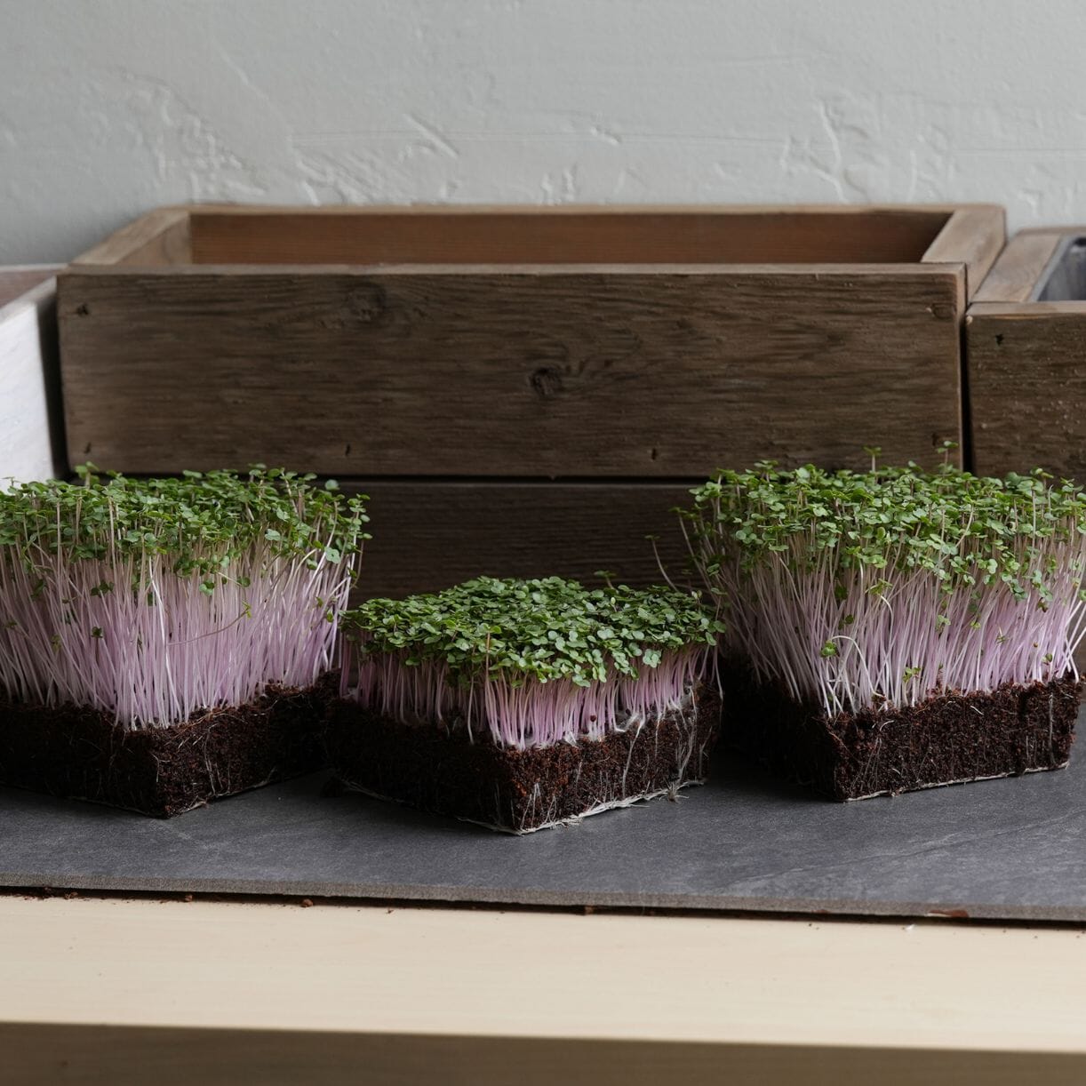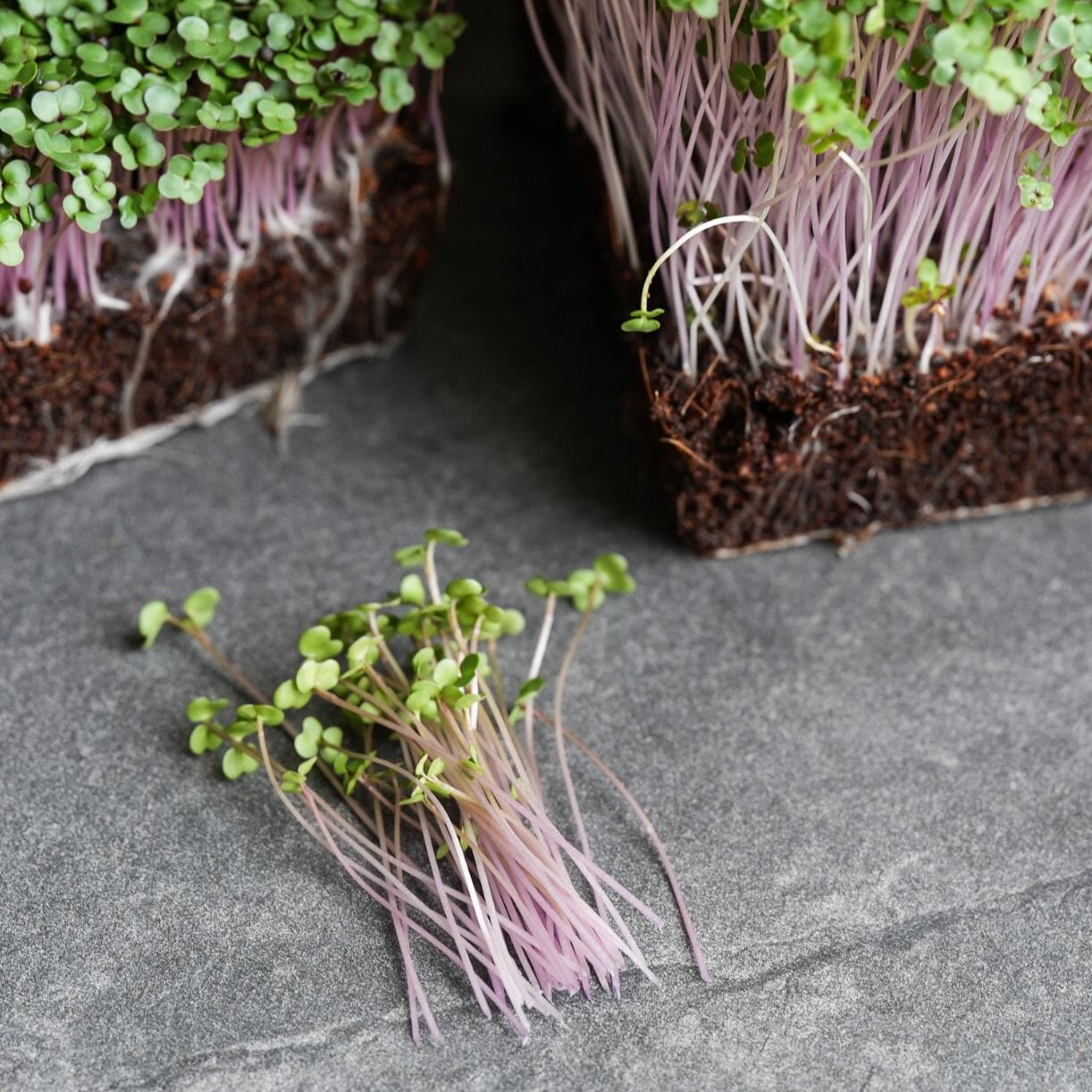 purple vienna kohlrabi microgreens - 3 different seed lots grown together