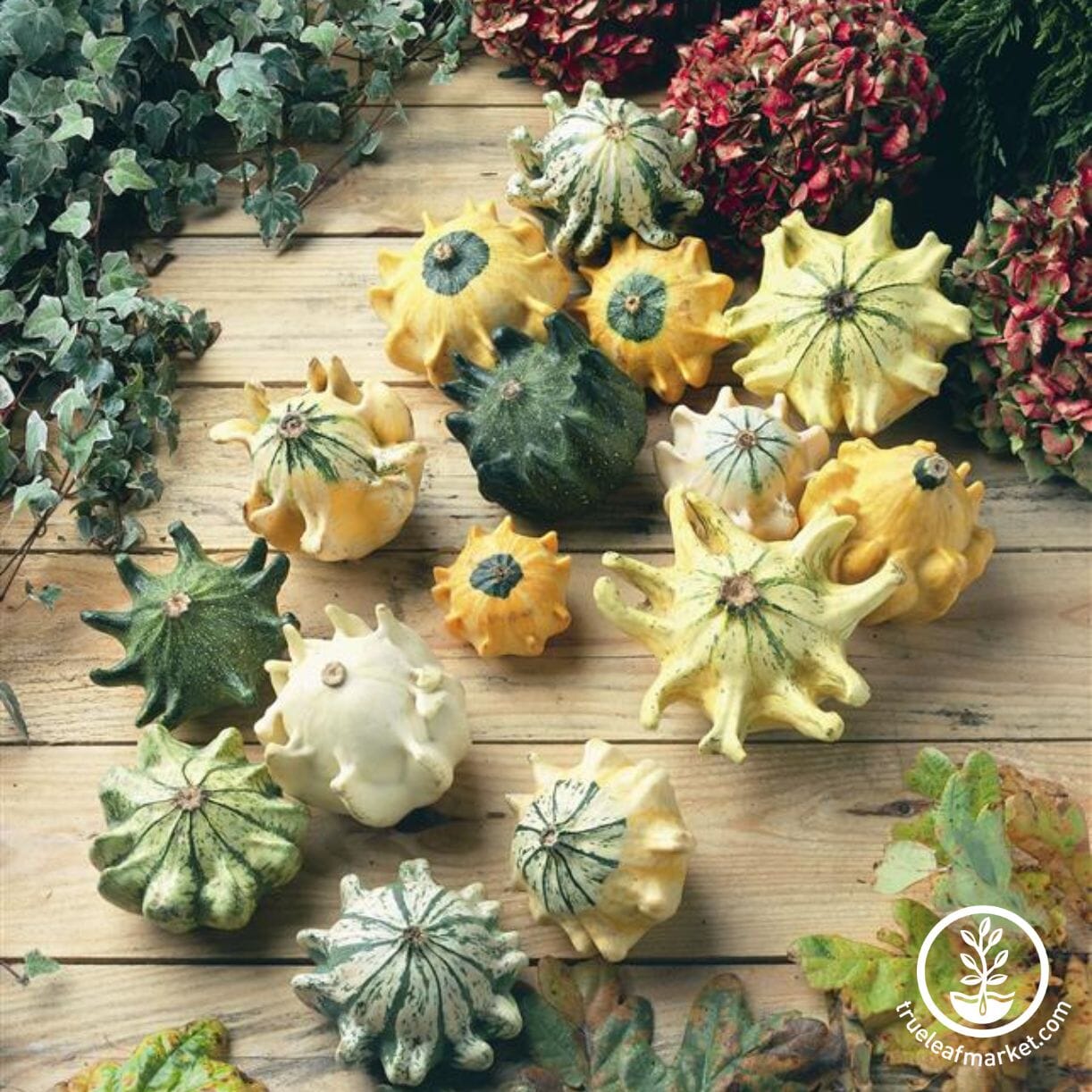 While smaller than other ornamental gourds like Corsican, Speckled Swan, and Turks Turban, the heirloom Shenot Crown of Thorns gourd is an eye-catching variety prized for its unique appearance.