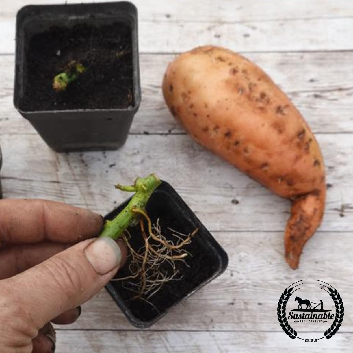 100 Days to maturity. Ipomoea batatas. Organic Beauregard Sweet Potato Slips. Non-GMO, warm-season perennial, propagated by slips. A classic, high-yield variety with reddish-brown skin and vibrant orange, moist, sweet flesh. Versatile for baking, roasting, frying, pies, and casseroles. Strong disease resistance and excellent storage ability.